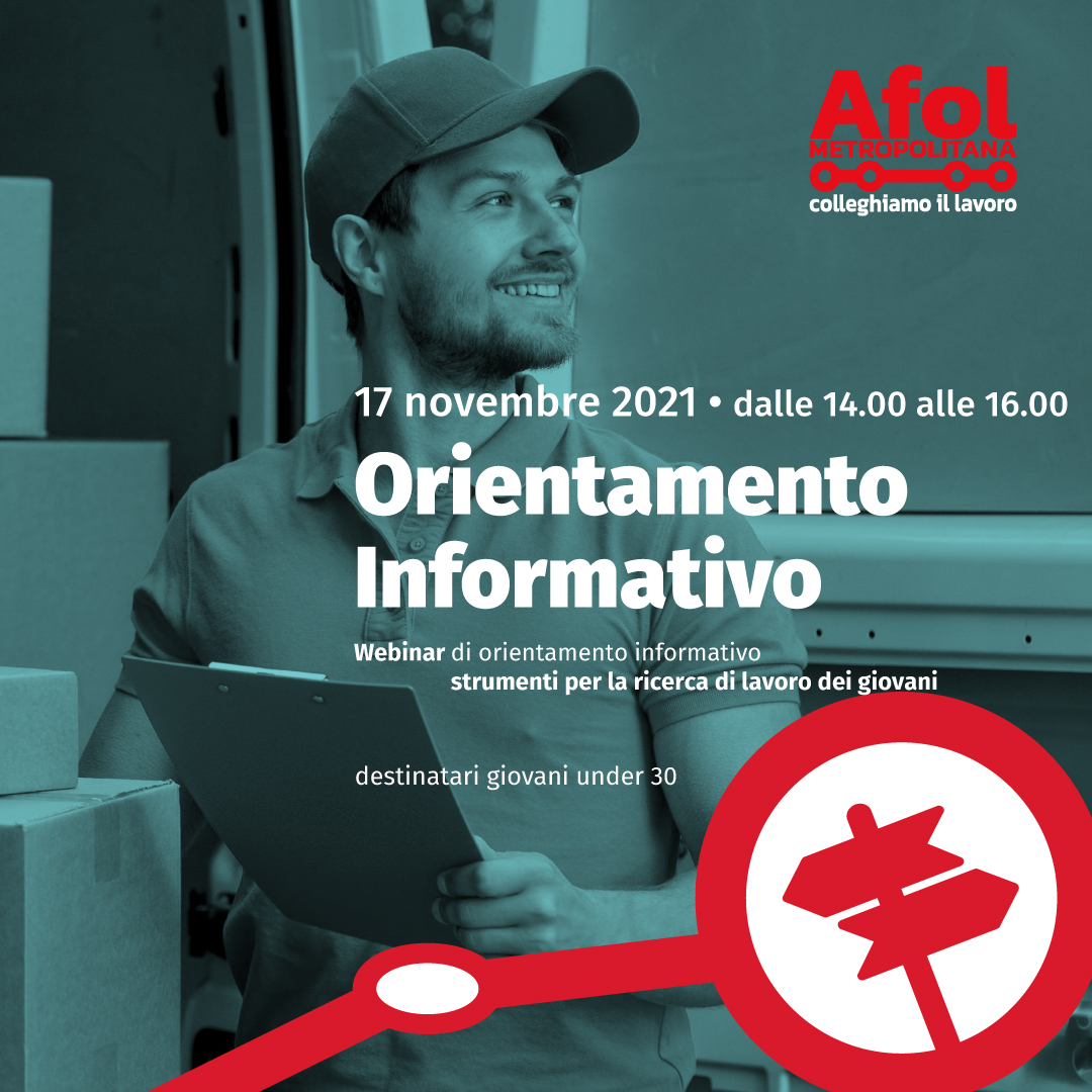Il giorno successivo, giovedì 18 novembre 2021, sempre dalle 14.00 alle 16.00, il webinar di orientamento informativo sarà destinato agli adulti over 30, dal titolo "Strumenti e metodi per attivarsi nella ricerca di lavoro".